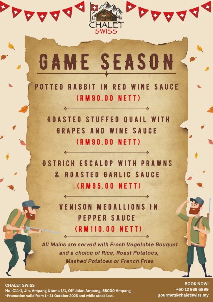 This October, Chalet Swiss celebrates the Alpine hunting tradition with a limited-time menu of exquisite game dishes — from tender ostrich and roasted quail to rabbit in red wine and venison medallions — each crafted with Swiss precision and served with seasonal accompaniments